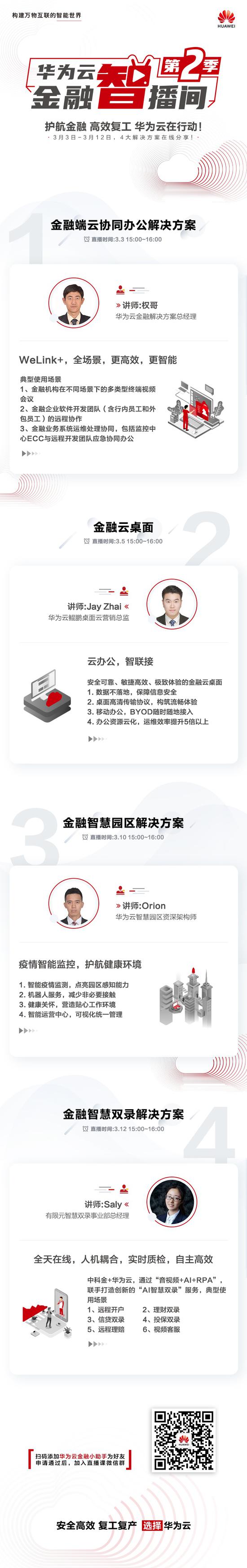 为进一步将解决方案落实到金融业的应用场景,华为云金融智播间计划于3月3日至13日,用四场线上直播讲解华为云金融解决方案是如何支撑企业疫情防控和复工复产的。内容将涵盖端云协同办公、云桌面、智慧园区和智慧双录四大金融行业主要应用场景,从端点、桌面、园区到场景四个层级由内而外全方位深化应用构建。